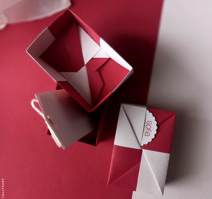 Scatolina a base romboidale in carta, realizzata a mano con tecnica origami, ideale per contenere confetti o piccoli doni. E' composta da due elementi ovvero una base ottenuta dalla piegatura di quattro fogli singoli ed un coperchio sovrastante composto anch'esso da quattro fogli che opportunamente piegati e incastrati formano questa particolarissima scatolina (il modello originale è di Tomoko Fuse).